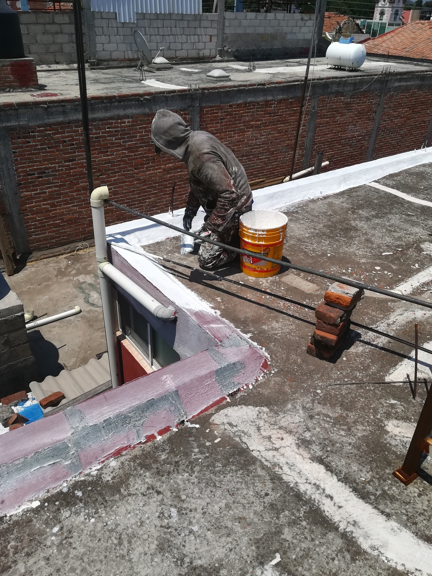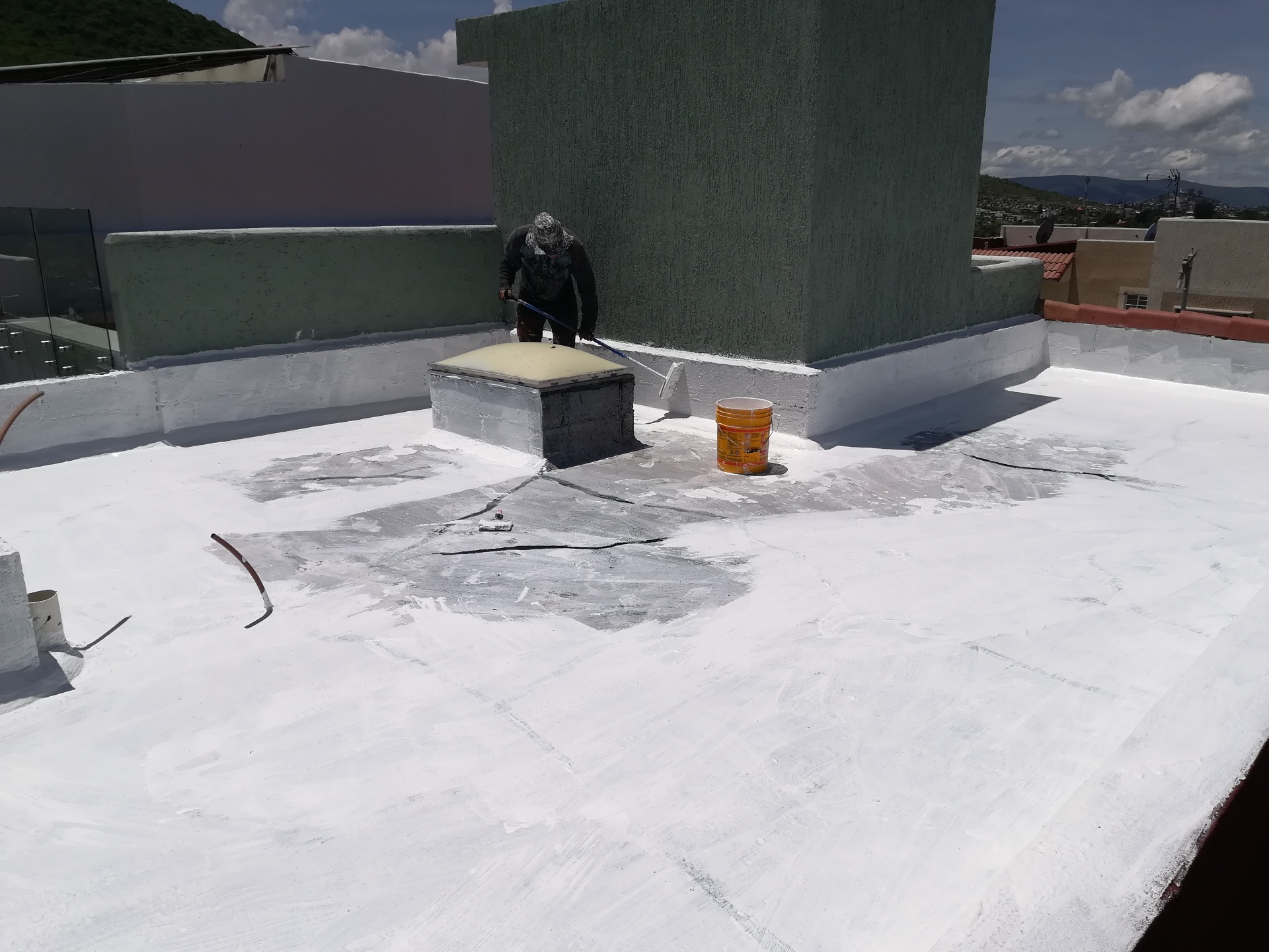 Aplicación de impermeabilizante "Acril Techo Power 6 años" blanco en muros, pretil y chaflanes.