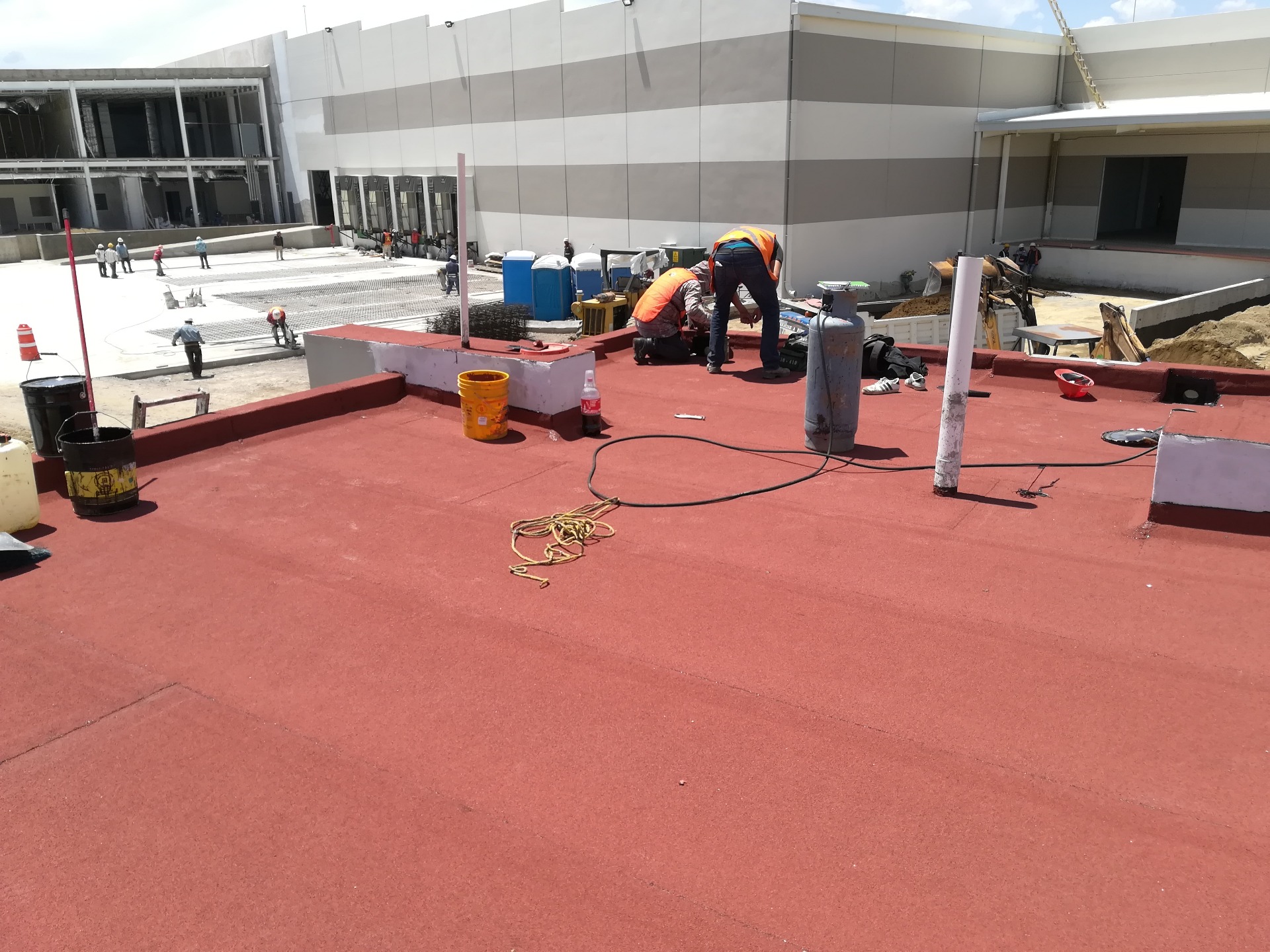 Aplicación de sika manto 3.5 mm. membrana de refuerzo de fibra de vidrio, rojo.